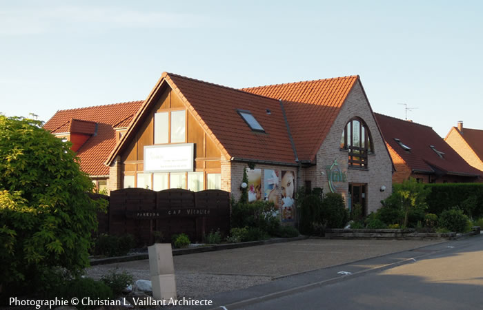 L’ensemble est construit en verre, bois « Cèdre rouge », bois d’Oregon, brique dans la gamme des roses, toiture tuile dans la gamme des rouges.