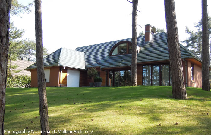 Cette habitation est construite en verre, bois « cèdre rouge », bois d’Oregon, Merbeau, brique dans la gamme des rouges, pierre bleue, toiture tuile plate dans la gamme des ardoisés.