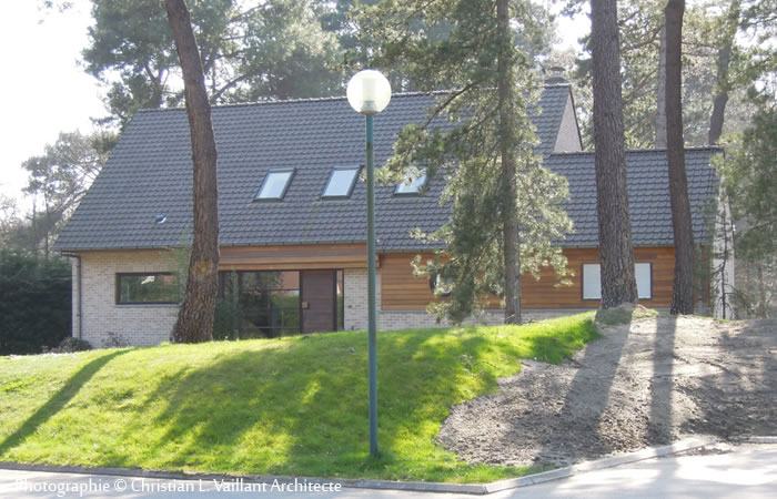 Cette habitation est construite en verre, bois « cèdre rouge », bois d’Oregon, Merbeau, brique dans la gamme des rosés, tuile dans la gamme des marrons.