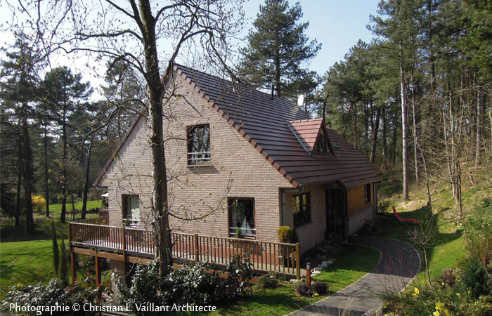 Cette habitation est construite en verre, bois « cèdre rouge », bois d’Oregon, Merbeau, brique dans la gamme des rouges, pierre bleue, la toiture est en tuile plate dans la gamme des rouges.