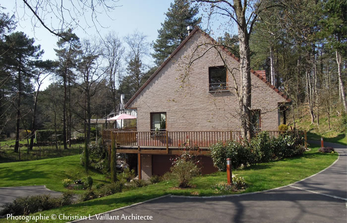 Cette habitation est construite en verre, bois « cèdre rouge », bois d’Oregon, Merbeau, brique dans la gamme des rouges, pierre bleue, la toiture est en tuile plate dans la gamme des rouges.