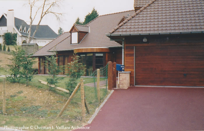 Cette habitation est construite en verre, bois « cèdre rouge », bois d’Oregon Merbeau, brique ton rosé, pierre bleue les toitures débordantes sont en tuile dans la gamme des marrons. Les sous-faces de toiture sont en « cèdre rouge »s