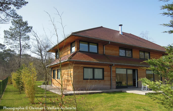 Cette habitation est en verre, les bardages en « cèdre rouge » La toiture en tuile dans la gamme des rouges.