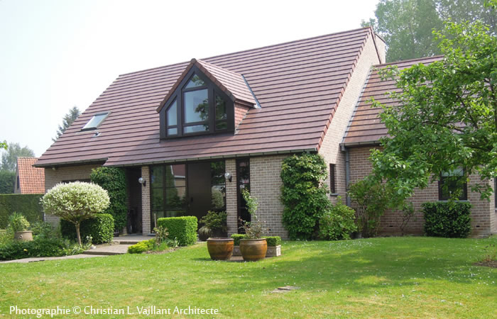 Cette habitation est en verre, en brique dans la gamme des rosés, en « cèdre rouge », bois d’Oregon et Merbeau, la toiture est en tuile plate, dans la gamme des rouges.