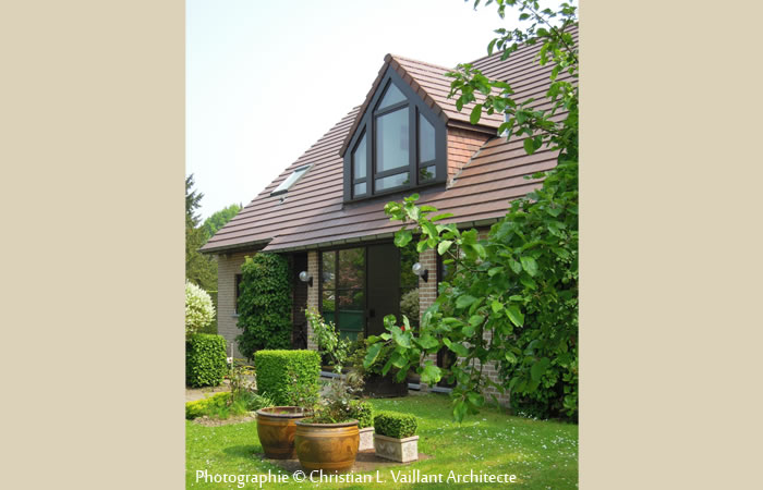 L’architecture de cette habitation est caractérisée par un jeu de volumes avec un grand Bowindow arrondi pour l’espace jardin d’hiver du rez-de-chaussée, un solarium en terrasse sur l’angle de la façade jardin avec le pignon. De ligne basse, elle est caractérisée pour de grands chiens assis en toiture.
