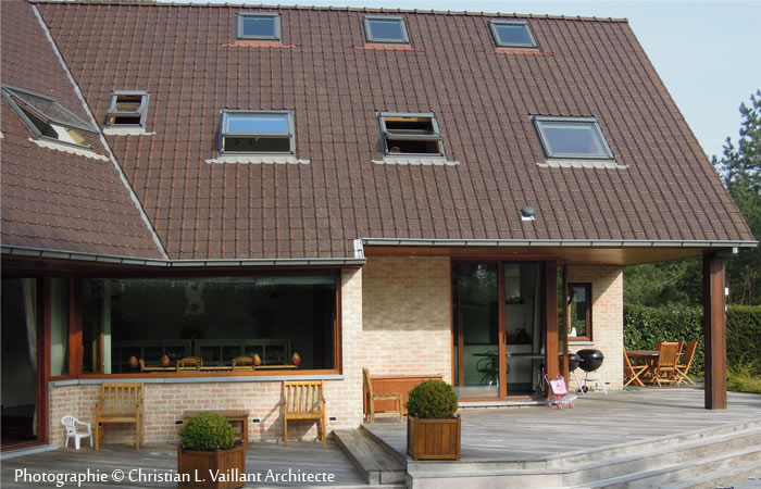 Elle est construite en verre, bois « cèdre rouge », bois d’Oregon, Merbeau, brique rosée, pierre bleue, tuile dans la gamme des rouges.
