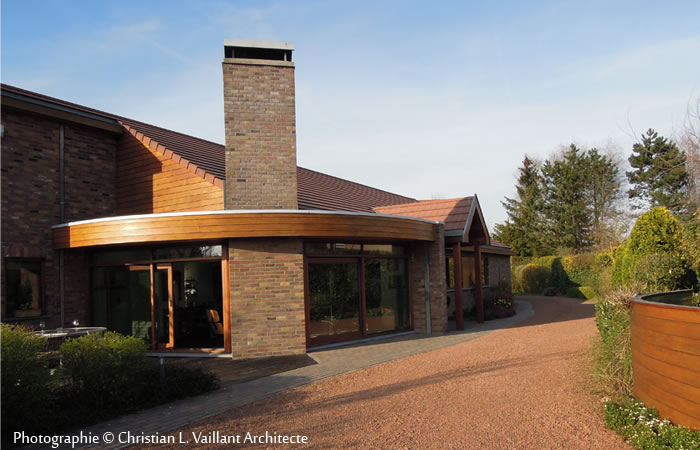 Elle est construite en verre, bois « cèdre rouge », bois d’Oregon, Merbeau, brique dans la gamme des rouges, pierre bleue, toiture tuile plate dans la gamme des rouges.