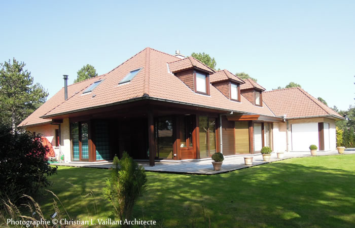 L’entrée est marquée par un auvent en bois sur poteaux. Cette habitation est construite en verre, bois « cèdre rouge », bois d’Oregon, Merbeau, brique dans la gamme des rouges, pierre bleue, toiture tuile dans la gamme des rouges.