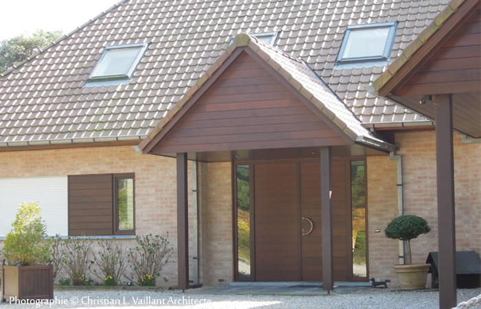 Cette habitation est construite en verre, bois « cèdre rouge », bois d’Oregon, Merbeau, brique dans la gamme des rouges, pierre bleue, toiture tuile dans la gamme des rouges.