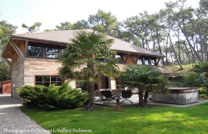Cette villa typique, inspirée des îles posée sur le gazon, dans un environnement boisé, s’organise sur deux niveaux sous une grande toiture débordante en pointe de diamant, avec bracons de soutiens.