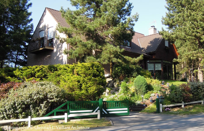 Cette villa typique située dans un environnement boisé est un mélange d’éléments classiques et contemporains. Cette habitation s’organise avec un grand volume sur lequel vient s’accrocher un volume surbaissé.