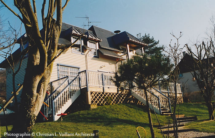 Cette villa s’articule en deux volumes décalés, recouverts de toitures se chevauchant en ardoise d’Espagne et chiens assis recouvert de zinc.