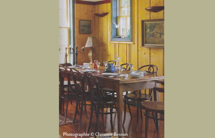 Cette villa typique « La Maison aux mille couleurs » blanche et bleue pour les bardages extérieurs se dresse sur les hauteurs de Houlgate en Normandie. Cette habitation venue d’ailleurs, de l’autre côté de l’Atlantique. Son propriétaire à parcouru le monde. Et amoureux du Canada et de long Island il a souhaité reconstituer quasi à l’identique les habitations de là bas. Cette villa s’articule en deux volumes décalés, recouverts de toitures se chevauchant en ardoise d’Espagne et chiens assis recouvert de zinc. L’ossature et la charpente de cette maison sont en épicéa. La façade principale est rythmée par un jeu de bowindow avec terrasse couverte au 1er étage et de châssis et chiens assis à guillotines et petits bois en aluminium de chez « Peachtree » Le bardage en pin de chez « Goodfellow » a été importé du Canada. Le jeu des toitures en décalé permet d’avoir un espace séjour de trois mètres de hauteur, avec poutres métalliques au plafond.